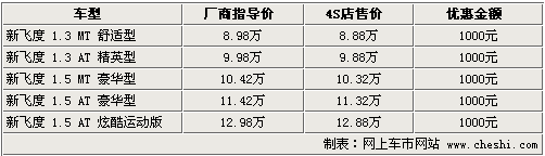 時尚精致的外觀,精細的內(nèi)飾做工,省油是飛度這款日系小車持續(xù)熱銷的原因。3月1日起,廣汽本田調(diào)整了飛度4款車型的售價,重新調(diào)整后的售價比原來的廠商指導(dǎo)價上漲了400元——3000元。目前消費者購車優(yōu)惠幅度在1000元左右,具體車型見下表: