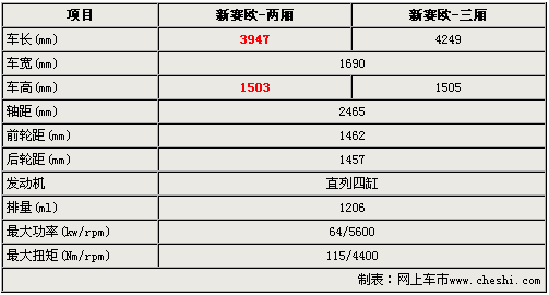 新賽歐兩廂版在保持車身寬度不變的基礎上,將車身長度和車身高度分別縮短和降低了302mm和2mm。新賽歐兩廂版雖然在車身尺寸方面略有變化,但整車軸距依然與三廂版車型保持一致,達2465mm。新賽歐兩廂版入門級車型搭載排量為1.2升的S-TEC系列發(fā)動機,最大功率和扭矩分別為64Kw和115Nm,與之相匹配的5速手動變速器和EMT半自動變速箱。