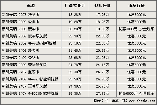 2010款凱美瑞于2010年3月1日在深圳正式上市,售價相較于09款有所調(diào)整,多款車型價格進(jìn)行了官方下調(diào)。售價區(qū)間為18.28-28.38 萬元。根據(jù)網(wǎng)上車市價格監(jiān)測系統(tǒng)顯示,目前2010款凱美瑞上市不到一個月就已經(jīng)開始出現(xiàn)優(yōu)惠,最高降幅達(dá)6000元。具體車型售價見下表: