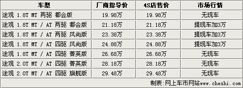 據(jù)北京地區(qū)上海大眾4S店銷售人員介紹,目前國產(chǎn)途觀已經(jīng)有部分車型抵達(dá)4S店展廳,其中包括手自一體都會(huì)版、兩驅(qū)風(fēng)尚版和四驅(qū)風(fēng)尚版,消費(fèi)者如果提現(xiàn)車的話,需要加價(jià)3萬元。該銷售人員表示,如果不加價(jià)預(yù)訂的話,需要半年才能提到現(xiàn)車。部分4S店表示,目前途觀有些現(xiàn)車是為已預(yù)訂的消費(fèi)者準(zhǔn)備,如果該消費(fèi)者退訂單,其他消費(fèi)者也可以加價(jià)3萬元提走該現(xiàn)車。