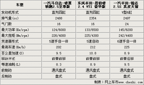 通過以上橫向?qū)Ρ龋梢钥闯鲱R磙I跑、思鉑睿和銳志的排量都在2.4這個(gè)區(qū)間,并且都具備了日系發(fā)動機(jī)傳統(tǒng)的特點(diǎn):性能良好、油耗經(jīng)濟(jì),但是發(fā)動機(jī)形式卻完全不同。從官方公布的等速油耗來看,睿翼轎跑的油耗要低于本田思鉑睿和豐田銳志,這與一汽馬自達(dá)強(qiáng)調(diào)的輕量化設(shè)計(jì)車身是分不開的。銳志采用了V型6缸發(fā)動機(jī),該發(fā)動機(jī)運(yùn)用了雙VVT-I技術(shù),因此在動力方面明顯要優(yōu)越于睿翼轎跑和思鉑睿,同時(shí)再加上銳志為后驅(qū)車型,再加上百公里加速僅為8.9秒,就從這兩點(diǎn)就也可以看出銳志是一款偏運(yùn)動的車型。在變速器方面,銳志略勝一籌,配備了手自一體式6速自動變速箱,思鉑睿則是5速自動變速器,是三款車型中配置較低的。三款車型的制動系統(tǒng)都是前通風(fēng)盤后實(shí)心盤。