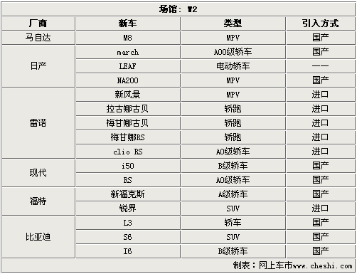 在W2館中,共有7家汽車廠商在此參展,其中福特將帶來國產(chǎn)新福克斯和SUV車型銳界;馬自達將帶來即將國產(chǎn)的MPV車型——馬自達8,而現(xiàn)代的兩款全新轎車——i50和RC也將于國內(nèi)消費者見面,其中A0級新車RC是北京現(xiàn)代自主研發(fā)車型。日產(chǎn)將在本屆車展帶來新款微車,據(jù)悉這款車型將在9月正式上市。當然還有將發(fā)布多款新車的雷諾品牌,新風(fēng)景在北京車展上亞洲首發(fā)。自主新軍比亞迪汽車,將發(fā)布L3、I6、S6等新車型。