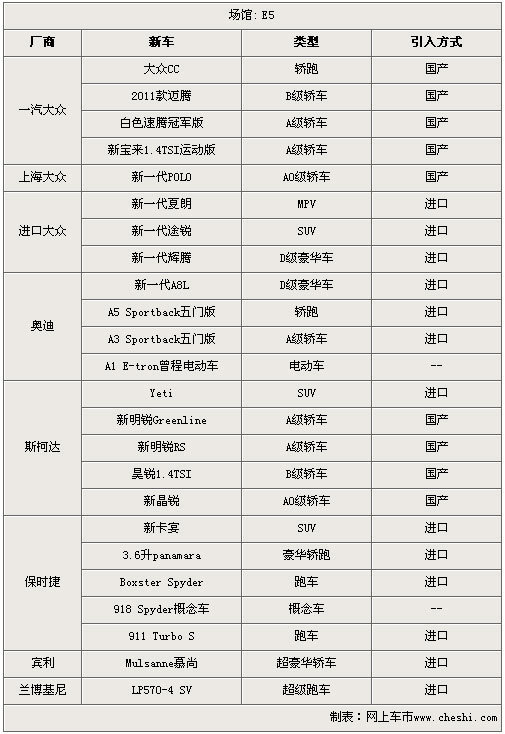 在本屆北京車展的E5館,一共有9家廠商再次館中布展,除了布加迪沒有新車之外,其他8家廠商均帶來了新車型與消費者們見面。一汽大眾帶來了備受矚目的國產(chǎn)版大眾CC以及新寶來1.4TSI等4款新車型,上海大眾則帶來了新一代的A0級小車POLO參展,進口大眾為大家?guī)砹诵乱淮句J、新一代輝騰等3款新車型,斯柯達也為大家?guī)砹耸卓頢UV產(chǎn)品Yeti等新車型,新A8L也在奧迪的新車隊列中;超跑品牌出現(xiàn)在了E5展館,保時捷為大家?guī)砹?18 Spyter概念車以及價格門檻更低的3.6升panamera等新車型,賓利以及蘭博基尼也為大家?guī)砹烁雍廊A以及速度更快的新車。