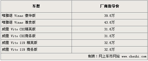 2010年4月23日,前不久在福建戴姆勒工廠下線的國(guó)產(chǎn)梅賽德斯-奔馳唯雅諾、威霆即將正式亮相北京車展,這標(biāo)志著奔馳全面吹響進(jìn)入高端MPV市場(chǎng)的號(hào)角。新工廠的竣工投產(chǎn)、新產(chǎn)品的下線展示,揭開(kāi)神秘面紗的唯雅諾、威霆在各自的展臺(tái)上格外引人注目,他們分別位于W4館和E601號(hào)。售價(jià)為:Vinao 豪華版 39.8萬(wàn);Vinao 尊貴版 43.8萬(wàn);Vito CDI精英版 31.6萬(wàn);Vito CDI商務(wù)版 31.8萬(wàn);Vito 119 精英版32.6萬(wàn);Vito 119 商務(wù)版32.8萬(wàn)。