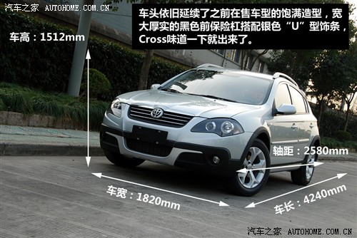 駿捷Cross的車身尺寸為4240mm×1820mm×1512mm,軸距依然為2580mm,與原型車駿捷FRV相比,除了底盤升高了20mm之外,中華駿捷Cross加裝了前后大包圍,標(biāo)配的全鋁制車頂行李架和蜂窩狀的進(jìn)氣格柵增加了動(dòng)感和活力,輪轂由FRV的15寸升級為16寸的鋁合金輪轂,在增強(qiáng)視覺效果的同時(shí),也使檔次得到一定提高。