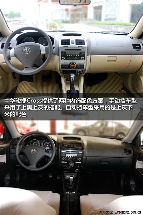 與個(gè)性的外觀相比,駿捷Cross在內(nèi)飾上似乎并沒有體現(xiàn)出什么特點(diǎn),呈現(xiàn)的一派典型的轎車化風(fēng)格,做工在自主品牌里面算是比較出色的,而且樣式也絕對不亞于同價(jià)位的合資車型,其中手動(dòng)擋車型采用的是上黑下灰的配色方案,而自動(dòng)擋車型則為更接近結(jié)局的上灰下米的色彩搭配。