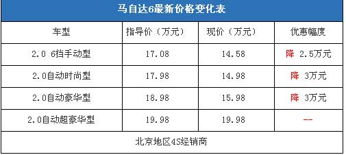 近日,編輯從北京地區(qū)方正利成一汽馬自達(dá)4S經(jīng)銷商處了解到,馬自達(dá)6的現(xiàn)車充足,優(yōu)惠幅度非?捎^,手動(dòng)擋車型降價(jià)2.5萬(wàn)元,而自動(dòng)擋車型最高可以降價(jià)3萬(wàn)元。據(jù)經(jīng)銷商透露,選擇分期付款,那么消費(fèi)者首付不足8萬(wàn)元就可以把曾經(jīng)的“神車”開回家。