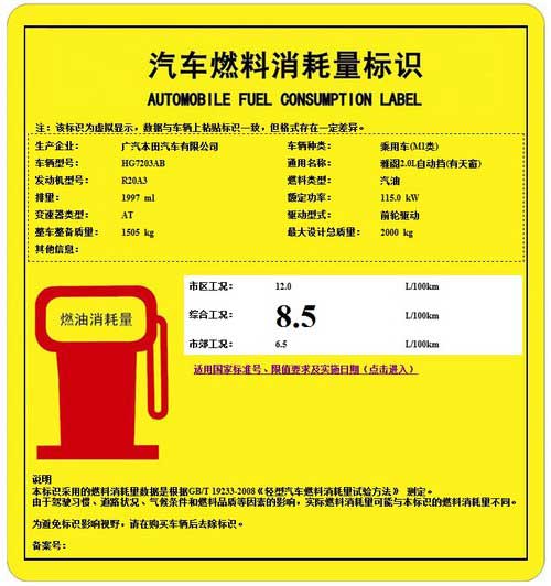 上兩圖為本田雅閣的2.0L和2.4L兩款版本的車型工況油耗標識,而它8.5L/100km和8.8L/100km的油耗平均只看起來很好看,但是同時不得不承認它的“體重”要比一般的歐美系轎車輕了一個成年人的重量。