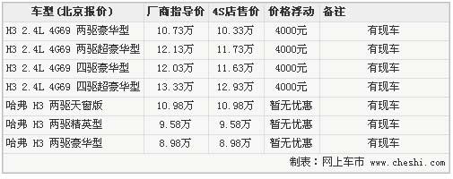據(jù)長(zhǎng)城汽車4S店銷售人員介紹,長(zhǎng)城哈弗H3的現(xiàn)車都比較齊全,并且出現(xiàn)了一定的優(yōu)惠幅度。但相比前幾個(gè)月,優(yōu)惠幅度卻有所減少,目前購(gòu)買哈弗H3 2.4L都可以優(yōu)惠4000元。另外銷售人員表示,長(zhǎng)城哈弗H3的廠商指導(dǎo)價(jià)只是白色普通漆車型,金屬漆其他顏色車型需要加價(jià)2000元。