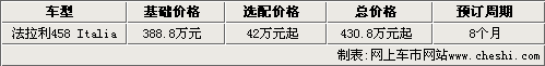 據(jù)法拉利北京展廳銷售人員介紹,目前法拉利458 Italia已經(jīng)有展車抵達(dá)展廳,消費者可隨時到店看車。而且法拉利458 Italia已經(jīng)開始接受預(yù)訂,起價為388.8萬元,消費者如果預(yù)定這款新車,至少要選裝42萬元的配置,總價格為430.8萬元起。另外,消費者如果現(xiàn)在下訂單的話,需要在明年1月份才能提到現(xiàn)車。