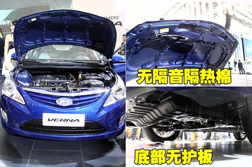 北京現(xiàn)代Verna的發(fā)動機艙布局比較規(guī)整,走線合理。在發(fā)動機蓋上輔以隔音材質(zhì),同時在靠近發(fā)動機后方的部分也設(shè)有隔音、隔熱層。車輛底部沒有裝備的底盤護板,使Verna在復雜路面行駛時其底盤少了一重保護,而且這款車型的發(fā)動機艙蓋開啟沒用采用液壓桿的設(shè)計。