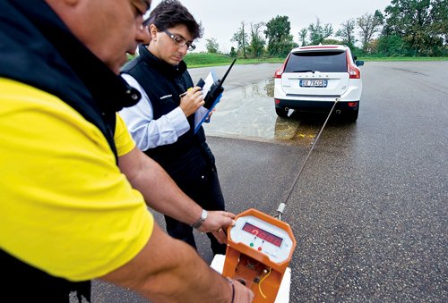 這一測試的目的在于測量車輛的牽引力,我們要使用一個十分精確的測量范圍達(dá)數(shù)千千克的測力計。正如在照片中看到的,車輛的四個輪子都在濕滑的大理石上,我們在上面說過,其附著力與在冰面上差不多。測力計的一邊通過一條鋼索與車體相連,另一邊固定在一個位置上。測試員啟動汽車把鋼索拉直,然后繼續(xù)加油直到車輪開始打滑,這時很多因素都要考慮,包括發(fā)動機(jī)功率、車的重量、輪胎的合成材料等,這些都是重要的參考數(shù)據(jù)。四驅(qū)車比兩驅(qū)車明顯占據(jù)上風(fēng),特別是XC60,其四驅(qū)版的牽引力比兩驅(qū)版高出了74%。Kuga兩個版本的差距為41%,略微小些。需要說明的是,正像前面說過的,沃爾沃兩款車的功率相差30馬力,其他方面沒有大的差別。在主要測試結(jié)束后,我們換了個地點(diǎn)重復(fù)剛才的測試,不是四個輪子都在大理石上,而是兩個在大理石上,兩個在瀝青上,仍然為濕滑路面。這也是為了測試防滑系統(tǒng)的功效,這時需要差速器的機(jī)械鎖止裝置發(fā)揮作用,Kuga和XC60上都沒有這一裝置。兩個輪子在瀝青上增加了附著力,可以看到測力計上顯示的數(shù)字與上次相比四輛車都增大了。福特兩驅(qū)車牽引力為602千克,四驅(qū)為820千克;沃爾沃兩款車的差距還是那么大,兩驅(qū)為710千克,四驅(qū)為1050千克。
