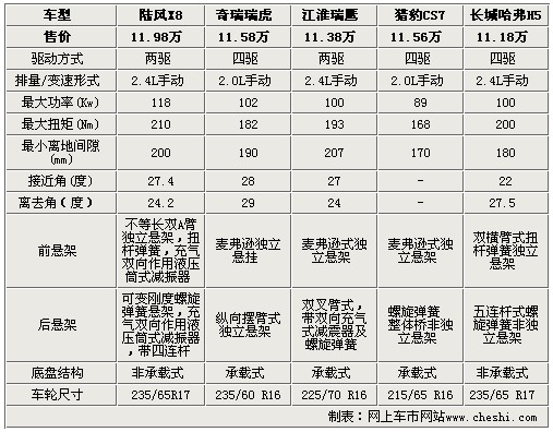首先,作為一款SUV,人們除了關(guān)注他們的基本信息外,更看重的就是它實際的通過性和操控性。通過上表我們可以看到,除了獵豹CS7,其他4款車型的離地間隙都處于一個比較優(yōu)秀的水平上,這為人們?nèi)粘3鲂薪加,順利通過略微惡略的路況提供了保障。另外,值得一提的就是5款SUV的底盤結(jié)構(gòu),瑞虎、瑞鷹和CS7三款都采用了中規(guī)中矩的承載式設(shè)計,而陸風(fēng)X8和哈弗H5則采用了純正的越野車底盤設(shè)計-非承載式,讓車輛在越野路況也可以更順暢的通過。