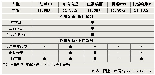 外觀方面,五款車均配備了獨(dú)立設(shè)計(jì)的前霧燈、后窗雨刷和鋁合金輪轂。而奇瑞瑞虎還配備了大燈高度調(diào)節(jié)功能,其他車型并未裝備。瑞虎、瑞鷹還為大家配備了更貼近家庭使用的電動(dòng)天窗,雖然天窗的實(shí)際使用率并不高,但是偶爾使用也是很愜意的。除了獵豹CS7,其余4款車都配備了車型行李架,為出行載物提供了不少的便利。
