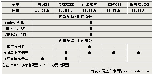 既然是一款SUV,我們就不能以評價轎車的標準來衡量它,畢竟造車的出發(fā)點是不同的。SUV車型更看重內(nèi)部載人載物的能力、駕駛安全性等能力。一些時尚新鮮的內(nèi)部配置我們還是留著在轎車上體驗吧。三款車的內(nèi)部都配備了行李箱照明燈、12V電源和遮陽板化妝鏡。但是在5款車中,僅有瑞鷹為使用者提供了更顯檔次的真皮方向盤。