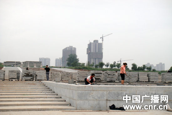 沿著太液池一路向西,在丹陛望月廣場的斜坡上,七八個建筑工人正在鋪石磚。一位姓孫的工人說,之前地上鋪的是大塊石板,鋪好后,工人又在上面雕了花紋,整體做了一朵花的造型,差不多得花了1000萬,這幾天全被揭了下來。換成了小塊的石磚。說起為什么要重新鋪小塊的石磚,這位工人笑了笑,說,前幾天來了幾位領(lǐng)導(dǎo)視察,說不好看。