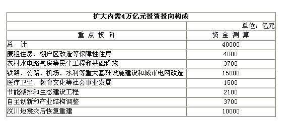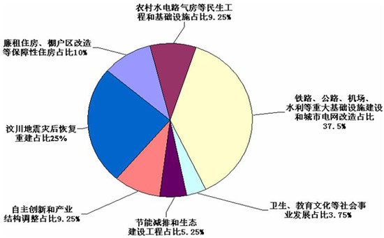 為了應對金融危機,2008年底,我國在出臺促進經(jīng)濟平穩(wěn)增長、改善民生、調(diào)整結構的一攬子計劃,并確定了防止資金被擠占挪用的檢查督察機制,以及引導民間資本擴大投資的方針政策。這項計劃涉及總投資4萬億元,包括中央投資總額為11800億元。