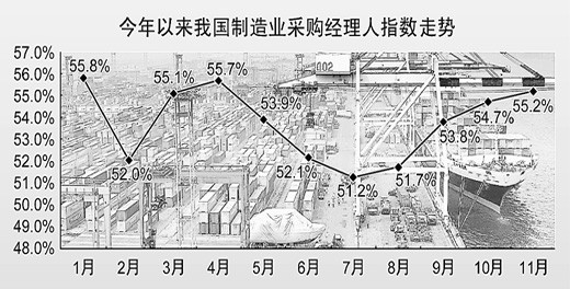 中國(guó)物流與采購(gòu)聯(lián)合會(huì)1日發(fā)布數(shù)據(jù),11月中國(guó)制造業(yè)采購(gòu)經(jīng)理指數(shù)PMI為55.2%,創(chuàng)近7個(gè)月來新高,環(huán)比上升0.5個(gè)百分點(diǎn)。自8月份以來,PMI指數(shù)連續(xù)4個(gè)月回升。