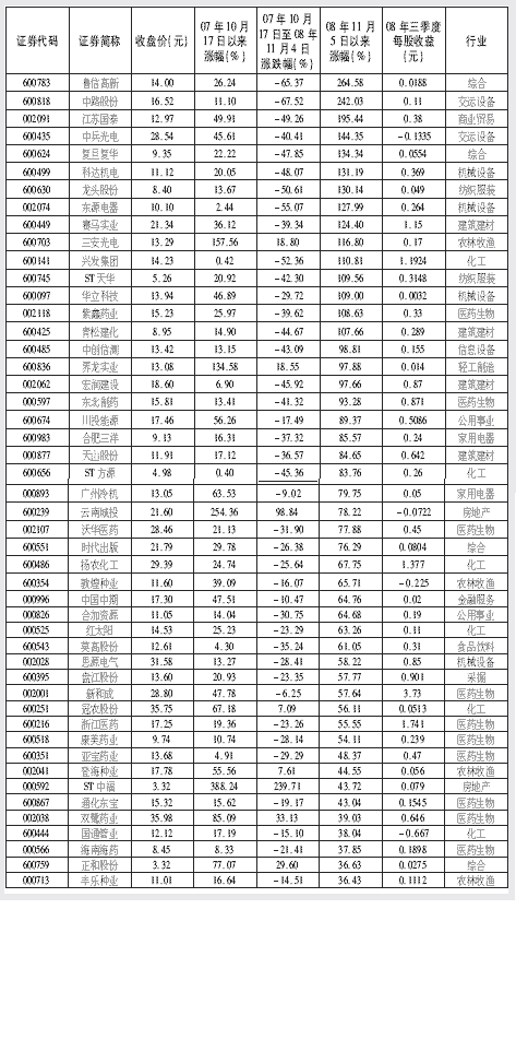據(jù)中國證券報信息數(shù)據(jù)中心統(tǒng)計,這73只股票可分為兩類。一類是先抑后揚,自2007年10月16日至2008年11月4日,有50只股票隨大盤下跌出現(xiàn)同步調(diào)整。跌幅超過20%的股票有32只。而這些股票自2008年11月5日以來表現(xiàn)活躍,有12只股票漲幅超過100%、18只股票漲幅在50%-100%之間,2只股票漲幅在30%-50%之間。