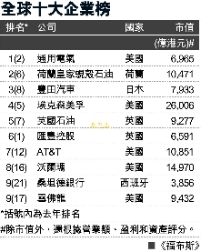 據(jù)香港《文匯報(bào)》消息,《福布斯》根據(jù)綜合評(píng)分定出是項(xiàng)排名,營(yíng)業(yè)額、盈利、資產(chǎn)和市值占同等比重。三甲位置分別由美國(guó)通用電氣、荷蘭皇家蜆殼石油和日本豐田汽車奪得,十大位置中,美國(guó)占了5席。