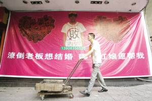 面對朋友的反對,他表示已做好心理準(zhǔn)備,橫幅懸掛一周未果后,他將啟程前往成都,將征婚范圍再擴(kuò)大。昨日,記者采訪離開時(shí),還沒有人前來應(yīng)征。(記者 蔣煬)