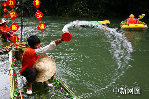 中新網(wǎng)廣州5月26日電(記者 莫非 通訊員 慧子)十多艘用竹作為材料扎制成的龍舟,長3.8米,寬1米,前方高翹,呈龍頭形狀,并且四周遍插五顏六色的鮮花,游客在船上打水仗、潑水、沐午時水,歡笑聲不斷。而漂亮的花龍舟從廣州流溪河源頭順流而下,徜徉在從化響水峽的漫天花海中,格外壯觀。