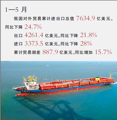 在內(nèi)需呈現(xiàn)升溫態(tài)勢(shì)的同時(shí),外需仍然持續(xù)萎縮。據(jù)海關(guān)統(tǒng)計(jì),5月份當(dāng)月,我國(guó)進(jìn)出口總值1641.3億美元,同比下降25.9%,降幅比今年前4個(gè)月累計(jì)同比降幅加深1.5個(gè)百分點(diǎn)。其中出口887.6億美元,降幅加深5.9個(gè)百分點(diǎn),進(jìn)口753.7億美元,降幅收窄3.6個(gè)百分點(diǎn)。