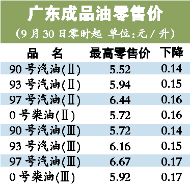 國家發(fā)改委決定從今天零時起降低成品油價,汽、柴油每噸降低190元。昨日,廣東省物價局公布了新的成品油最高銷售價格。國Ⅱ標準90號汽油每升下調0.14元,93號汽油每升下調0.15元,97號汽油每升下調0.16元,0號柴油每升下調0.16元;國Ⅲ標準90號汽油每升下調0.14元,93號汽油每升下調0.15元,97號汽油每升下調0.17元,0號柴油每升下調0.17元。(記者葉平生 通訊員岳佳綜)