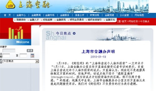 據(jù)上海金融辦網(wǎng)站刊出的聲明指出,《財(cái)經(jīng)網(wǎng)》有關(guān)“上海將嘗試個(gè)人海外投資”的報(bào)道,純屬“無(wú)中生有”,上海市金融服務(wù)辦公室主任方星海,從未就此問(wèn)題接受采訪(fǎng),對(duì)《財(cái)經(jīng)網(wǎng)》不負(fù)責(zé)任的行為,表示遺憾。