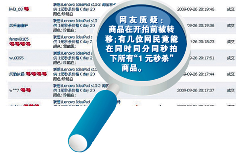 淘寶的安民公告,仍然為部分網(wǎng)友所不能接受。天涯網(wǎng)友“秋風(fēng)月無痕”認(rèn)為,淘寶沒出面解釋何以有三人能在同一分同一秒同時秒下三件商品。“內(nèi)有種種怪異之事,不得不讓人想到這是一場欺騙廣大中國人民的炒作行為。如果淘寶不能給出合理的讓人信服的解釋,那么最終受害的不單單是廣大受騙的群眾,更是淘寶網(wǎng)! “秋風(fēng)月無痕”及幾名網(wǎng)友隨后在跟帖中貼出當(dāng)晚截圖,聲稱既然當(dāng)晚人太多,“不能正常瀏覽頁面”,而實際上商品已經(jīng)在20時03分之前下架,但網(wǎng)友卻截圖發(fā)現(xiàn)有多條20時17分到20時19分的記錄,“淘寶怎么解釋這幾條記錄,03分到17分之間是空的,但是17分到19分之間突然冒出幾條記錄,這能讓人不懷疑是做了手腳嗎?”