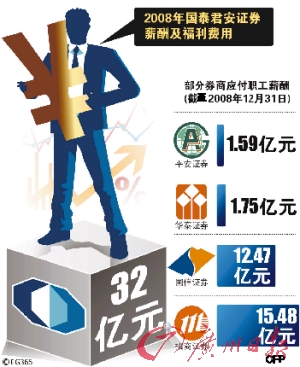 近日記者獲得了一份《2009年國泰君安證券總裁陳耿工作報(bào)告》,細(xì)讀中記者發(fā)現(xiàn),國泰君安證券2008年的薪酬及福利費(fèi)用高達(dá)32億元,遠(yuǎn)遠(yuǎn)超出公司年初預(yù)算數(shù)的20.41億元。即使面對(duì)大熊市,國泰君安在滬深兩市的交易量也排在全國所有券商的前三甲。目前國泰君安員工數(shù)大約在3200人左右,按報(bào)告中32億元的總薪酬及福利費(fèi)用計(jì)算,平均每個(gè)員工去年獲得的總收入就接近100萬元。