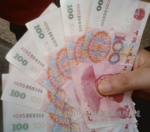 上午,家住綿陽(yáng)御營(yíng)壩的錢(qián)先生向記者介紹說(shuō),他前幾天在御營(yíng)壩一柜員機(jī)上取了一千元錢(qián),與朋友一起到某餐館吃飯買(mǎi)單時(shí),收銀員告訴他二百元是假幣,錢(qián)先生將自己所取的一千元錢(qián)全部拿到驗(yàn)鈔機(jī)上進(jìn)行檢驗(yàn),發(fā)現(xiàn)除一張是真幣外,其余九張都是HD95版本的鈔票。由于他在取錢(qián)時(shí)沒(méi)有索要取款票據(jù),現(xiàn)在手里拿的9張HD版鈔票只好自認(rèn)倒霉。