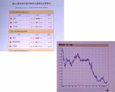 2月5日,聯(lián)想宣布柳傳志重掌聯(lián)想的消息后,新浪網隨后對柳傳志復出進行了問卷調查。截至第二天上午九點就有兩萬余人參與調查,結果顯示:58.4%的網友看好柳傳志重新出任董事長,選擇不看好的只有24.8%,認為聯(lián)想因此能再創(chuàng)輝煌的網友達52.5%,市場層面也反應積極,聯(lián)想集團股票在2月6日大漲11%,而在今年以來,聯(lián)想股價已經下跌了33%。