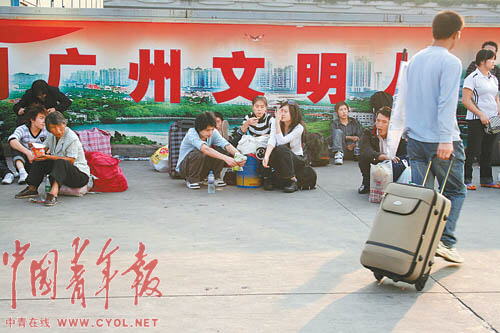 2月6日,正月十二。春節(jié)期間侵襲珠三角的寒潮剛剛過(guò)去。廣州火車站門前的廣場(chǎng)上,到處是肩挑背扛、行色匆匆的旅客。還有很多人散坐在廣場(chǎng)上,等待回鄉(xiāng)或者進(jìn)入珠三角腹地。