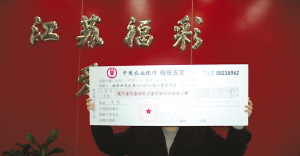 4月2日上午,中獎(jiǎng)?wù)邉⒕?化名)來(lái)到江蘇福彩中心領(lǐng)走巨獎(jiǎng)。