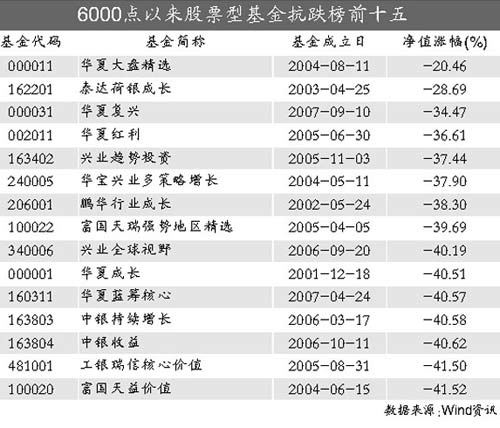 與之相比,基金也不示弱。如果對2007年10月16日前成立的182只股票型基金進(jìn)行統(tǒng)計,Wind數(shù)據(jù)顯示,從6124點到本周一,這182只股票型基金凈值平均跌幅為51.04%。同期,上證指數(shù)的跌幅已超過了65%。這也意味著,在本輪反彈之后,基金已經(jīng)恢復(fù)到股指3000點的水平。其中,跌幅小于51.04%的為89只,也就是說,這89只基金已經(jīng)收復(fù)3000點失地。