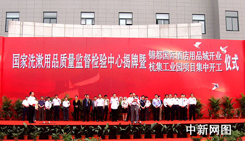 中新網(wǎng)邗江五月十八日電(記者 崔佳明 馬春陽(yáng))五月十八日,江蘇邗江在杭集鎮(zhèn)舉行國(guó)家洗漱用品質(zhì)量監(jiān)督檢驗(yàn)中心揭牌暨錦都國(guó)際酒店用品城正式開業(yè)、杭集工業(yè)園項(xiàng)目集中開工儀式。中國(guó)輕工業(yè)聯(lián)合會(huì)綜合業(yè)務(wù)部副主任查長(zhǎng)全、省質(zhì)監(jiān)局副局長(zhǎng)張亞青、揚(yáng)州副市長(zhǎng)聞道才、邗江區(qū)委書記程裕松、區(qū)長(zhǎng)韓方等領(lǐng)導(dǎo)出席,活動(dòng)由區(qū)長(zhǎng)韓方主持。