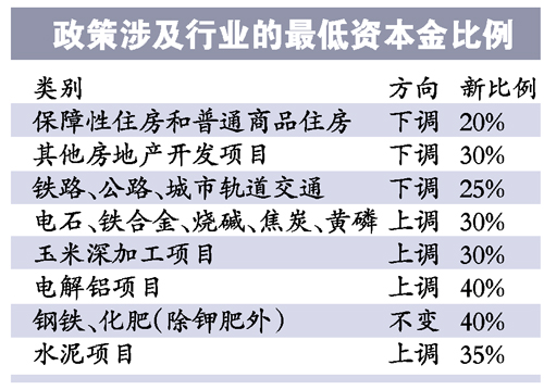 根據(jù)此次調(diào)整,大部分行業(yè)的最低資本金比例下調(diào)了5~10個百分點,其中保障性住房和普通商品住房項目下調(diào)15個百分點,大大超出此前的預(yù)期,而鐵路、公路等交通和大型基建項目也是此次資本金比例調(diào)整的主要受益對象。高污染、高能耗和產(chǎn)能過剩的項目則被上調(diào)最低資本金比例。