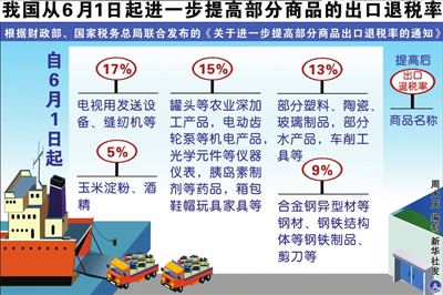 經(jīng)國務(wù)院批準(zhǔn),財(cái)政部和國家稅務(wù)總局昨天聯(lián)合發(fā)布通知,宣布從6月1日起再度提高部分商品的出口退稅率,此次調(diào)整涉及農(nóng)產(chǎn)品深加工、機(jī)電、鞋帽、玻璃制品、鋼鐵制品等制造業(yè)領(lǐng)域超過2600個(gè)稅目的商品。