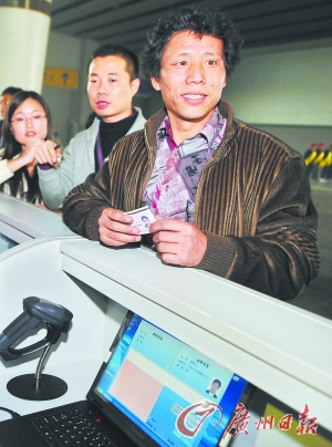 來(lái)自湖南邵陽(yáng)、在中山橫欖鎮(zhèn)某建筑工地做泥水工的唐結(jié)元成了今年春運(yùn)廣州實(shí)名制火車票查驗(yàn)進(jìn)站的第一人。昨天下午2時(shí)不到,他扛著行李來(lái)到琶洲展館候乘點(diǎn)驗(yàn)證臺(tái)前。工作人員先將機(jī)票二維碼放在掃描器處掃了一下,電腦屏幕顯出L7688次車票的信息,還有唐結(jié)元的姓名和身份證號(hào)碼。接著她又將唐結(jié)元的身份證放在閱讀器上,電腦屏幕又顯示出唐結(jié)元的個(gè)人信息。接著,屏幕顯示“通過(guò)”字樣。工作人員隨即在車票上蓋上“廣鐵集團(tuán)廣州火車站實(shí)名驗(yàn)訖”的章。整個(gè)過(guò)程不超過(guò)20秒。據(jù)悉,對(duì)于一代證和其他十幾種的購(gòu)票證件都需要人工驗(yàn)票。