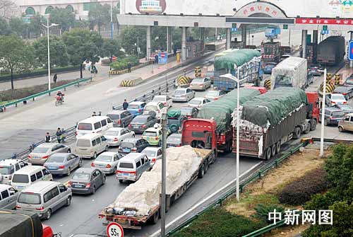 中新網九江2月7日電 (胡國林)連日來,九江長江大橋車輛驟增,自2月6日8時至7日8時,九江長江大橋車輛日通行量達到3.1萬輛以上,已超過大橋的承載飽和數近60%,堵車嚴重,排隊車流自大橋收費處蔓延數公里。