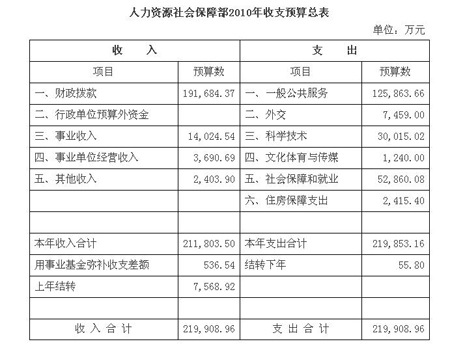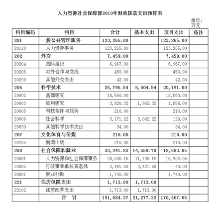 據(jù)人社部網(wǎng)站消息顯示,根據(jù)《財(cái)政部關(guān)于批復(fù)人力資源和社會(huì)保障部2010年部門預(yù)算的通知》(財(cái)預(yù)[2010]205號(hào)),人社部2010年預(yù)算情況如下: