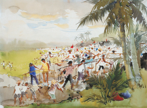 我鉆進椰子林作畫,其熱無比,連油色的錫管都燙手。忘了在何處,林中小蟲特多,咬得緊,穿著長褲、長袖襯衣,且將袖口和衣領(lǐng)都包得嚴嚴實實,但回到宿店才知滿身都是紅塊塊,奇癢難忍,店主頗可憐我,說:氓!氓!我聽不懂廣東話,她用筆寫,原來是蚊。