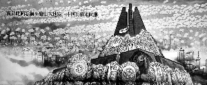 繪制長卷前后歷時四年,中間數(shù)易其稿,嘔心瀝血,終于在今年完成了這幅高18.5米、長80多米的《唐山大地震祭》巨幅長卷。長卷分為地震將臨、神兵天降、自救互救、八方支援、傷員外運、清尸防疫、恢復(fù)生產(chǎn)、重建家園、再組家庭、歡送親人十部分。為表現(xiàn)唐山地震中的磨難,我們以“祭”字為切入點,展示唐山人在大悲大痛面前的壯烈激昂,以黑白為基調(diào),全景式地展現(xiàn)凝重悲壯的場景,勾勒出母親的哀慟、孩童的驚恐、人們絕望而又渴生的奮爭,以及在那死亡彌漫的廢墟間閃動著無數(shù)紅領(lǐng)章和五角星,讓觀者如身臨其境。當(dāng)年唐山抗震救災(zāi)指揮部副總指揮遲浩田將軍特為畫卷題詞:“那萬眾一心,共赴危難的感人情景,令我終生難忘!