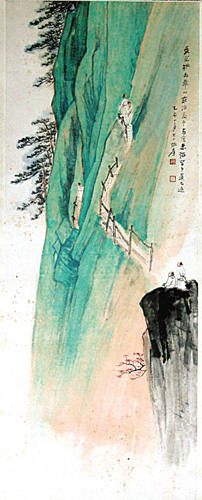此外,張大千描繪華山長(zhǎng)空棧道險(xiǎn)峻奇崛的《華山行》,以145.6萬(wàn)元成交。張大千于1935年游浙江莫干山、洛陽(yáng)龍門及西安、華山,并為此舉辦了“關(guān)洛紀(jì)游畫展”,《華山行》即創(chuàng)作于此時(shí)。在似青綠山水卻又色不重的大片綠中,畫一長(zhǎng)空棧道,著以赭色,十分醒目?諚I隙它c(diǎn)兩游者,相背、扶壁而立,一者小心看風(fēng)景,似不敢再往前;一者已有悔意,正想返身而下,這正應(yīng)和了畫面的款識(shí)“予每度來游,皆中道而返”,或許是大千自己的寫照吧。