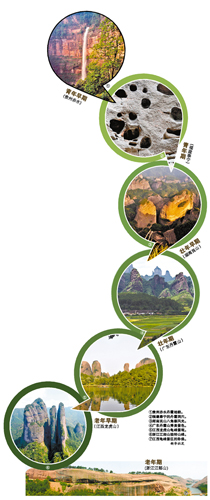 “中國(guó)丹霞”項(xiàng)目提名地包括廣東丹霞山、貴州赤水、福建泰寧、湖南崀山、江西龍虎山、浙江江郎山等6個(gè)省的6處國(guó)家級(jí)風(fēng)景名勝區(qū),它們分別代表了丹霞地貌從青年、壯年向老年演化的典型過(guò)程,構(gòu)成了一個(gè)不同發(fā)育階段和不同景觀類(lèi)型的完整系列,具有全球意義和突出普遍價(jià)值。