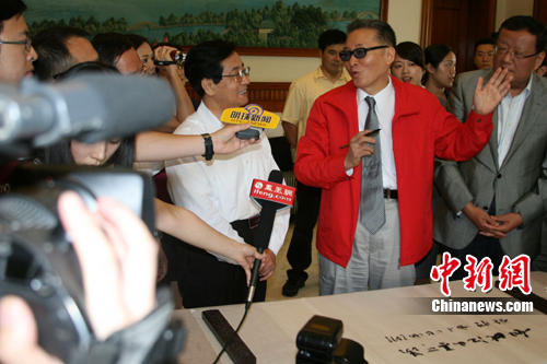 李敖寫罷擱筆。在一旁的趙洪祝出人意料拿起筆,在李敖題字“如此江山真可羨”的“真”字上補(bǔ)了一筆,原來(lái)剛才李敖題字筆墨不勻,真字上沒(méi)有出頭。