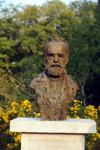 這是10月16日拍攝的雨果雕像。 10月16日,為紀(jì)念圓明園罹劫150周年,圓明園舉行雨果雕像揭幕儀式,青銅質(zhì)地的雨果半身雕像正式與游人見面。雕像高84厘米,寬50厘米,重90公斤,位于大水法遺址東側(cè),在底座上用中法文字鐫刻了說明詞,表達(dá)了“永久呼喚文明與和平的尊重,永久紀(jì)念人類的正義與良心”的愿望。在雕像南側(cè)書型石雕上鐫刻著雨果強(qiáng)烈譴責(zé)1860年英法聯(lián)軍洗劫圓明園暴行的《致巴特勒上尉的信》。雕像由法中友好聯(lián)合會、中國人民對外友好協(xié)會和法國東方華人協(xié)會共同捐贈,法國雕塑家娜什拉·凱努制作。新華社記者羅曉光攝