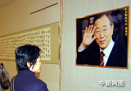 中新網南寧1月11日電(記者 劉萬強)聯(lián)合國秘書長潘基文“亮相”中國廣西博物館正在舉行的2009年潘氏迎春書畫藝術作品展上,在該項展覽中,潘基文作為潘氏名人,他的兩幅照片被掛在展廳內的顯著位置。