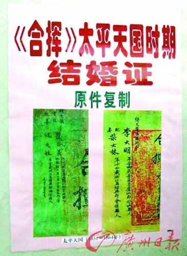 《合揮》中合是結(jié)合,揮是憑證之意,太平天國時(shí)期廢除封建買賣婚姻,男女雙方要求結(jié)婚時(shí),先經(jīng)過主管婚姻的婚娶官批準(zhǔn),然后發(fā)給繪有龍鳳圖記的《合揮》婚書,方能成婚。
